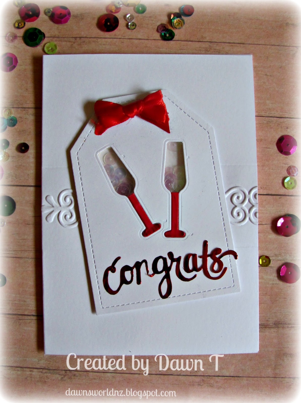 I started by die cutting a tag (Pretty Pink Posh) and then cutting out the champagne glass. I cut the top off and coloured the bottom and inlaid. The rest of the glass was made a shaker with some clear sequins. I used a embossing folder to add some interest to the base card. I used some red glimmer card to die cut the congrats.